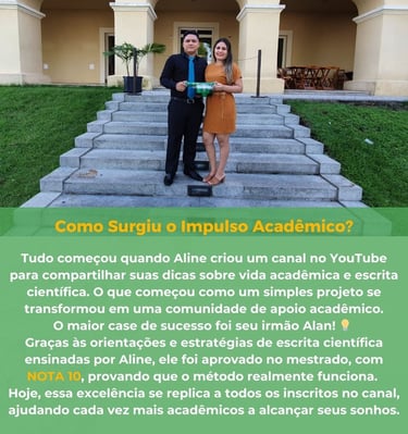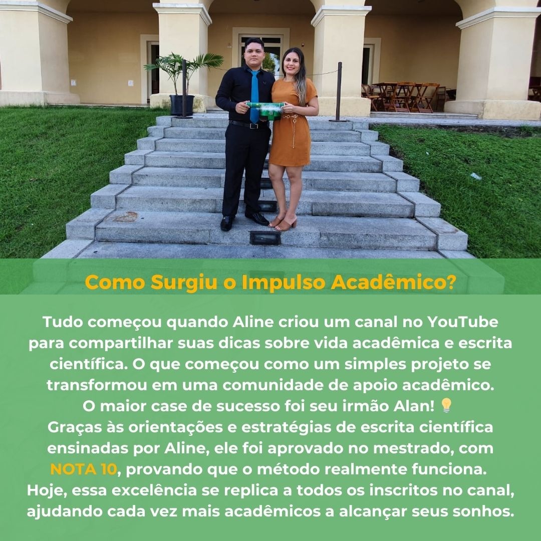 Tudo começou quando Aline criou um canal no YouTube para compartilhar suas dicas sobre a vida acadêmica e escrita científica. O que começou como um projeto simples se transformou em uma comunidade de apoio acadêmico.