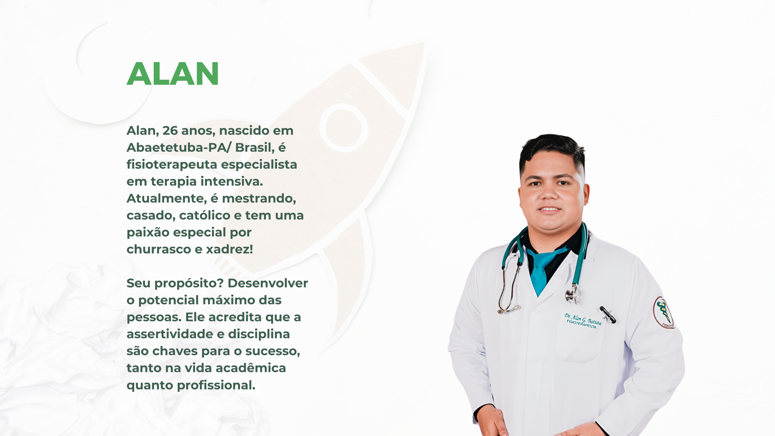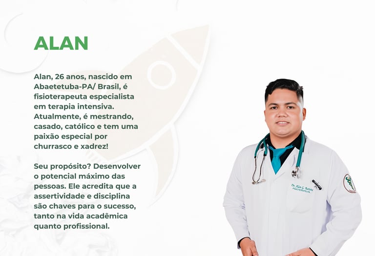 Sou Alan Batista, fisioterapeuta especialista em terapia intensiva e mestrando na UFPA. Casado, católico e apaixonado por churrasco e xadrez, acredito que disciplina e assertividade são essenciais para o sucesso acadêmico e profissional. Meu propósito é ajudar as pessoas a desenvolverem seu potencial máximo com estratégia e determinação. Sou movido por fé e propósito e me dedico a guiar acadêmicos em suas jornadas. Acredito que, com o apoio certo, todos podem alcançar mais do que imaginam, tanto na vida acadêmica quanto profissional.